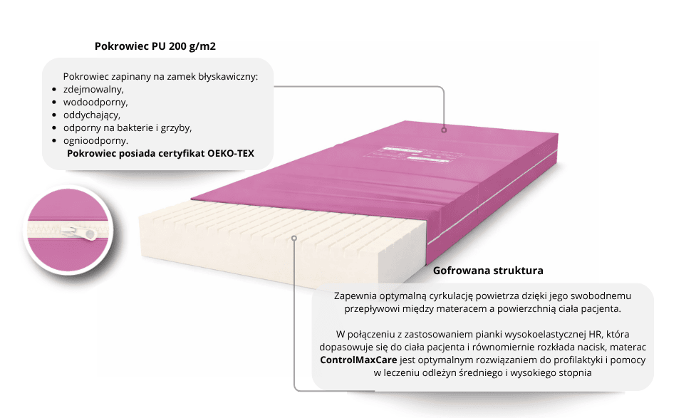 ControlMAXCare to materac piankowy zaprojektowany z myślą o pacjentach wymagających stabilnego podparcia, wysokiego komfortu i skutecznej ochrony przeciwodleżynowej. Przeznaczony jest dla osób o masie ciała do 320 kg, dlatego sprawdza się zarówno w placówkach medycznych i opiekuńczych, jak i w opiece domowej.