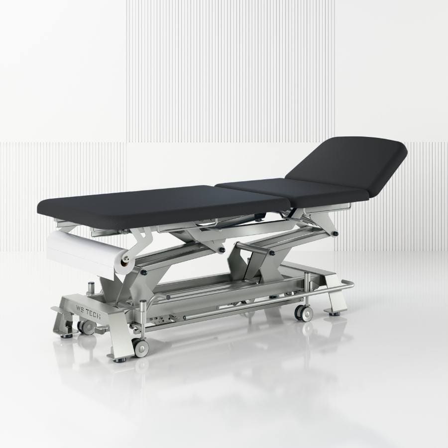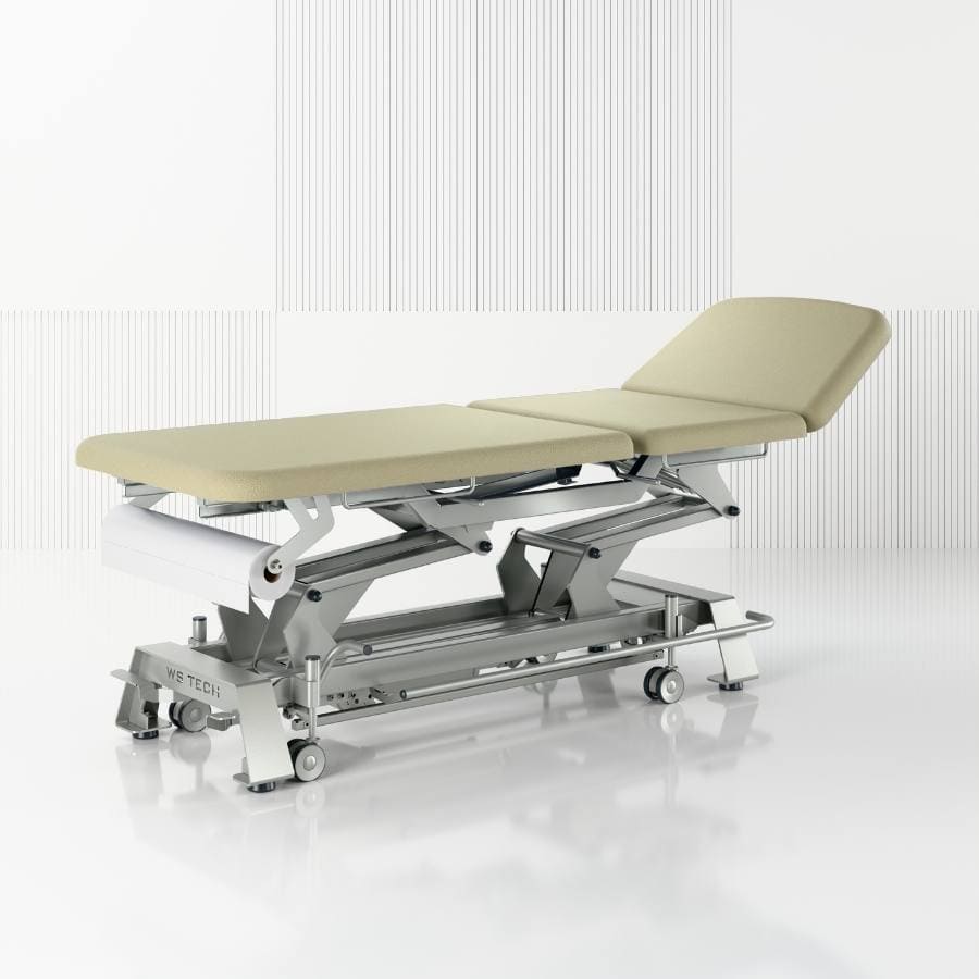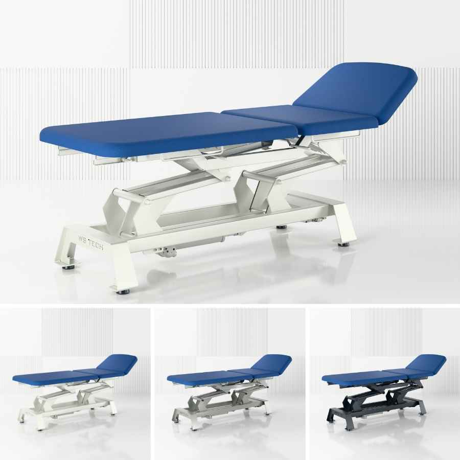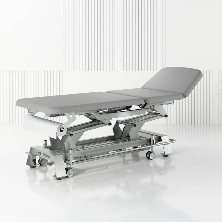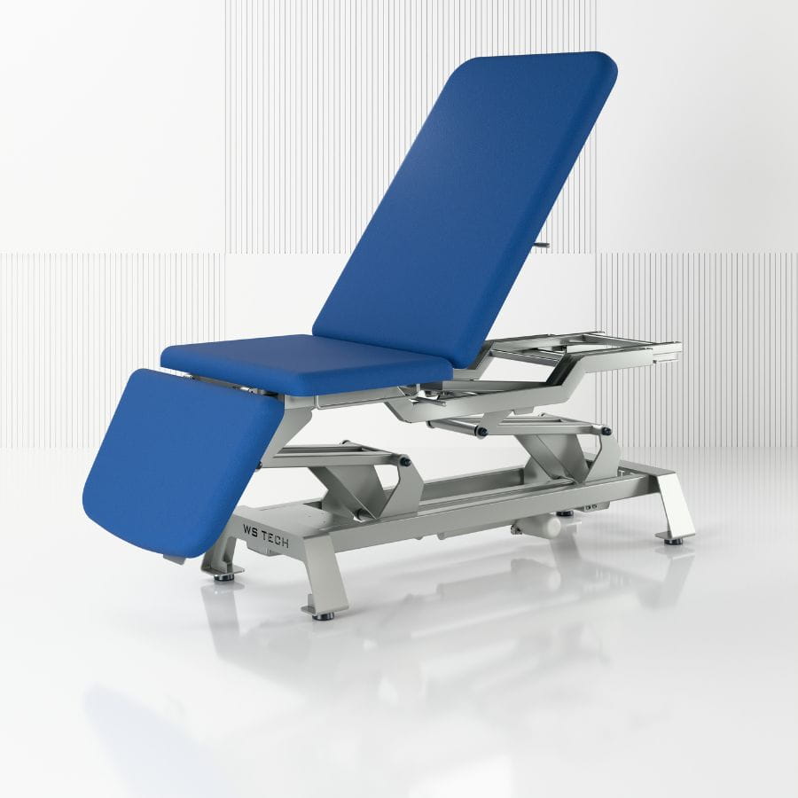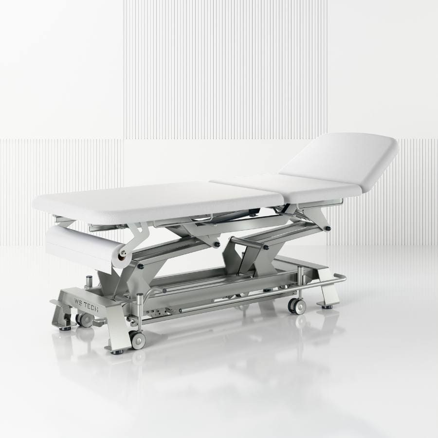Stół rehabilitacyjny elektryczny, 3-sekcyjny (sekcja zagłówka, sekcja lędźwiowa, sekcja nóg). Stół posiada pełną regulację wszystkich sekcji leża oraz maksymalne obciążenie do 160 kg (opcjonalnie 200 kg). Regulacja wysokości stołu odbywa się za pomocą siłownika elektrycznego. W stole rehabilitacyjnym SS-E04 zastosowano w pełni łożyskowany mechanizm regulacji wysokości. Poszczególne części blatu regulowane są poprzez sprężyny gazowe lub opcjonalnie za pomocą siłowników elektrycznych. Stół jest wyposażony w ergonomiczny zagłówek z wygodnym i komfortowym otworem na twarz z zatyczką.