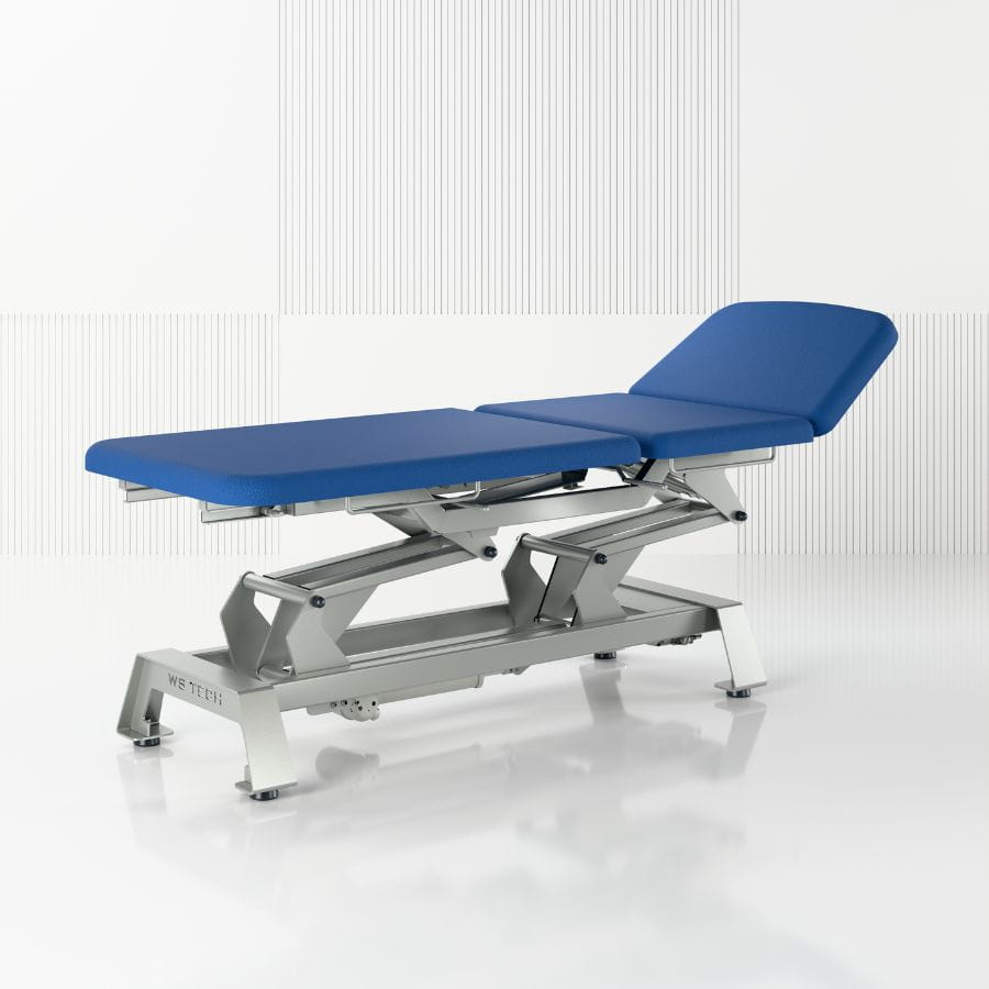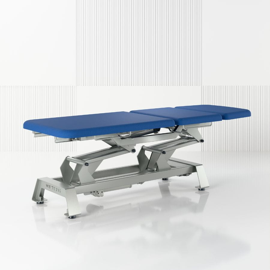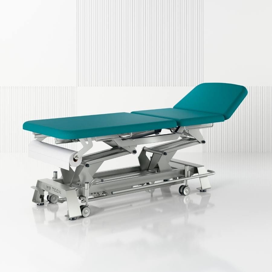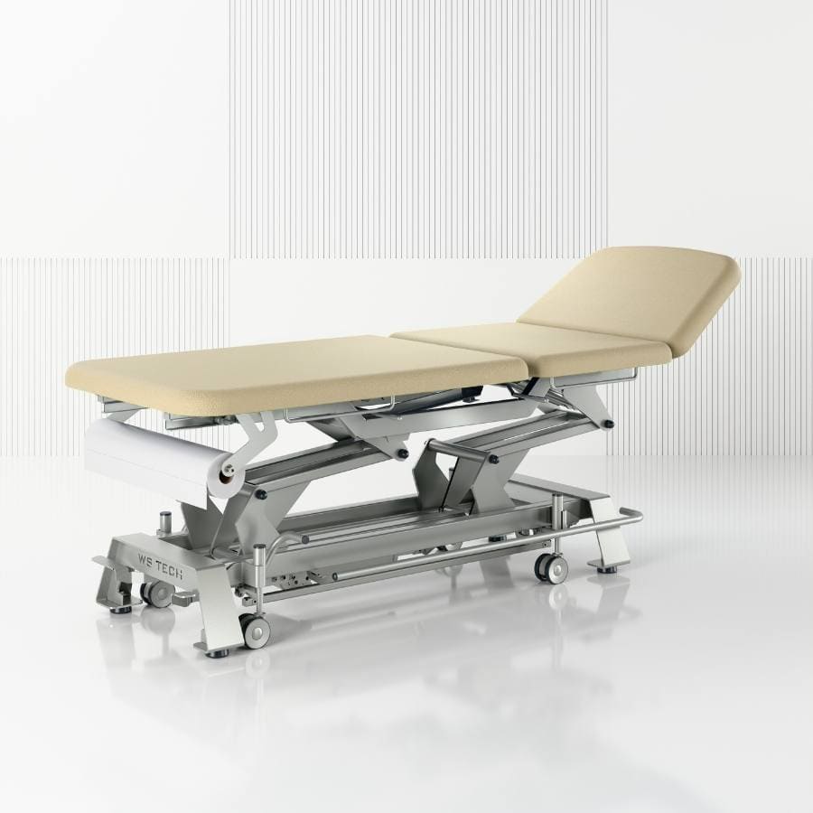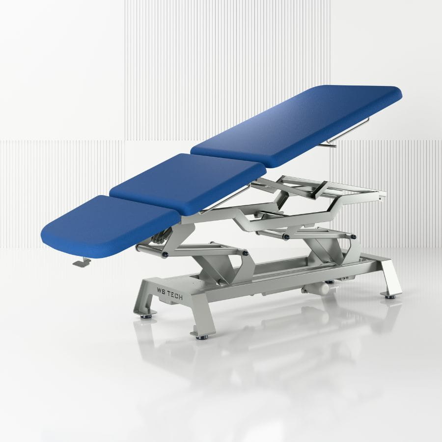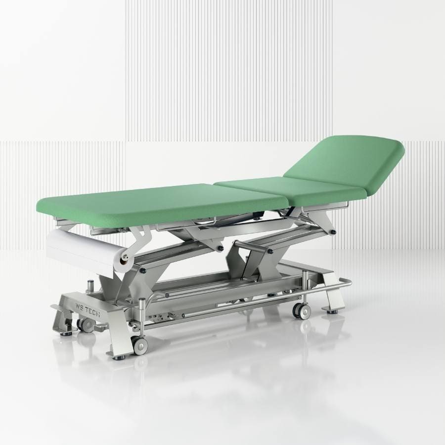 Stół rehabilitacyjny elektryczny, 3-sekcyjny (sekcja zagłówka, sekcja lędźwiowa, sekcja nóg). Stół posiada pełną regulację wszystkich sekcji leża oraz maksymalne obciążenie do 160 kg (opcjonalnie 200 kg). Regulacja wysokości stołu odbywa się za pomocą siłownika elektrycznego. W stole rehabilitacyjnym SS-E04 zastosowano w pełni łożyskowany mechanizm regulacji wysokości. Poszczególne części blatu regulowane są poprzez sprężyny gazowe lub opcjonalnie za pomocą siłowników elektrycznych. Stół jest wyposażony w ergonomiczny zagłówek z wygodnym i komfortowym otworem na twarz z zatyczką.